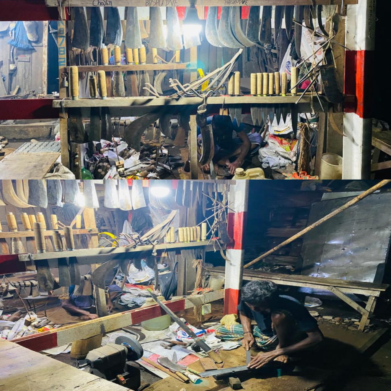কেউ কেউ হাতুড়ি পিটিয়ে তৈরি করছেন দা, বটি, ছুরিসহ মাংস কাটার বিভিন্ন সরঞ্জাম।