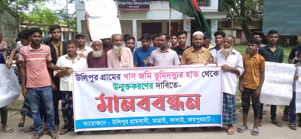 জয়পুরহাটের কালাই উপজেলার মাত্রাই ইউনিয়নের উলিপুর গ্রামবাসীর আয়োজনে ১১ ই সেপ্টেম্বর ২০২৪ বৃহস্পতিবার সকাল সাড়ে দশটায় উলিপুর গ্রামের ভূমি উদ্ধার প্রধান সমন্বয়ক রেজওয়ানের নেতৃত্বে বের হয়ে কালাই উপজেলা পরিষদের গেটের সামনে জয়পুরহাট বগুড়া মহাসড়কের পার্শ্বে অত্র উলিপুর গ্রামের খাস জমি ভূমি দস্যুর হাত থেকে উন্মুক্তকরণের দাবিতে আধা ঘন্টা বাপি মানববন্ধন কর্মসূচি অনুষ্ঠিত হয়।