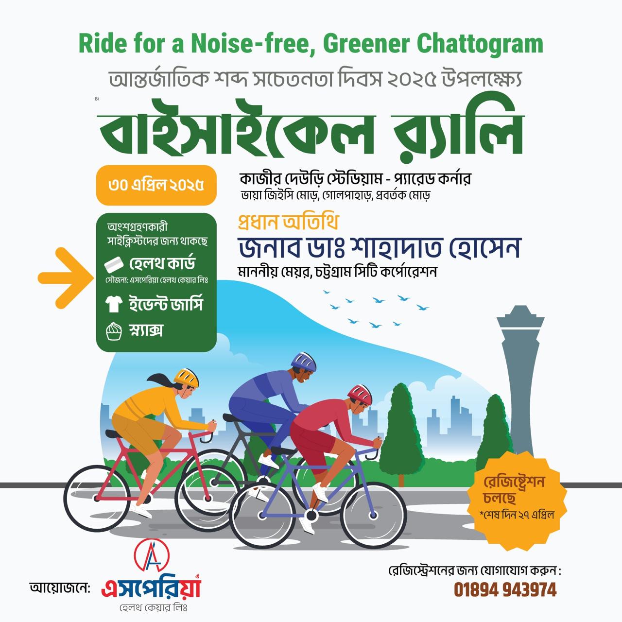 শব্দ দূষণ রোধে জনসচেতনতা বৃদ্ধির লক্ষ্যে চট্টগ্রামের স্বনামধন্য সুপার স্পেশালিটি ল্যাবরেটরি “এসপেরিয়া হেলথ কেয়ার লিমিটেড” ও চট্টগ্রাম সিটি করপোরেশন এর যৌথ উদ্যোগে গতকাল নগরীতে এক বর্ণাঢ্য সাইকেল র্যালির আয়োজন করা হয়।