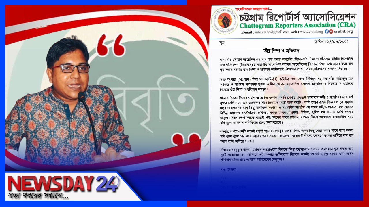 আজ বুধবার (২৪ জুন) সিআরএ কার্যনির্বাহী কমিটির পক্ষ থেকে সিনিয়র সহ সভাপতি আজিজুল হক আজিজ ও সাধারণ সম্পাদক নুরুল আমিন খোকন সাংবাদিক সোহাগ আরেফিনের বিরুদ্ধে অপপ্রচারের বিরুদ্ধে তীব্র নিন্দা ও প্রতিবাদ জানান।