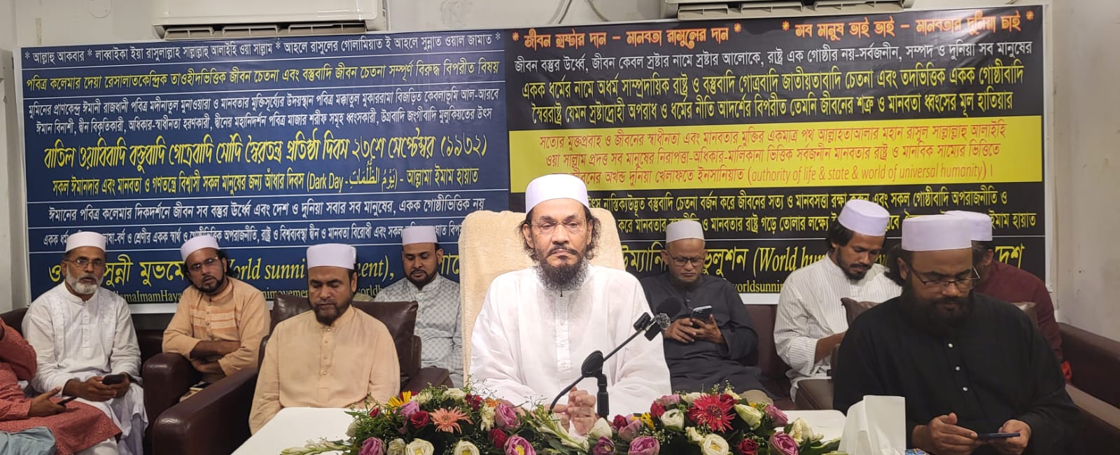 বিশ্ব সুন্নী আন্দোলন ও বিশ্ব ইনসানিয়াত বিপ্লবের প্রতিষ্ঠাতা আল্লামা ইমাম হায়াতের নির্দেশনায় এবং মহাসচিব আল্লামা শেখ রায়হান রাহবারের সভাপতিত্বে অনুষ্ঠিত সমাবেশে আল্লামা ইমাম হায়াত বলেন, মুমিনের প্রাণকেন্দ্র কেবলাভূমি আল আরবে ঈমান বিনাশী, দ্বীন বিকৃতিকারী,অধিকার-স্বাধীনতা হরণকারী, দ্বীনের মহানিদর্শন পবিত্র মাজার শরীফ সমূহ ধ্বংসকারী, উগ্রবাদি জংগীবাদি মুলুকিয়তের উৎস বাতিল ওয়াবিবাদি বস্তুবাদি গোত্রবাদি সৌদি স্বৈরতন্ত্র প্রতিষ্ঠা দিবস ২৩শে সেপ্টেম্বর (১৯৩২) সকল ঈমানদার এবং মানবতা ও গণতন্ত্রে বিশ্বাসী সকল মানুষের জন্য আঁধার দিবস।