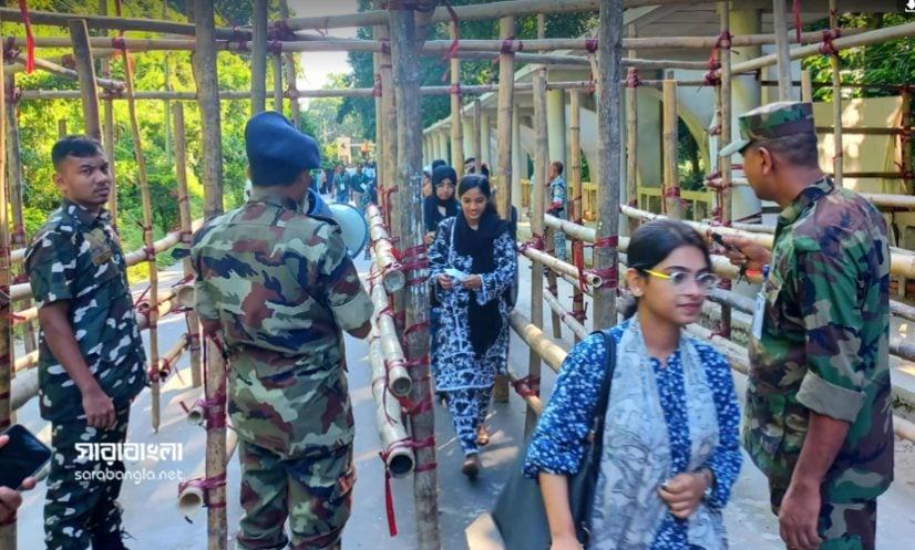 কাটাপাহাড় এলাকায় একজন ভোটারের পরিচয়পত্র দেখছেন বিশ্ববিদ্যালয়ের নিরাপত্তাকর্মীরা