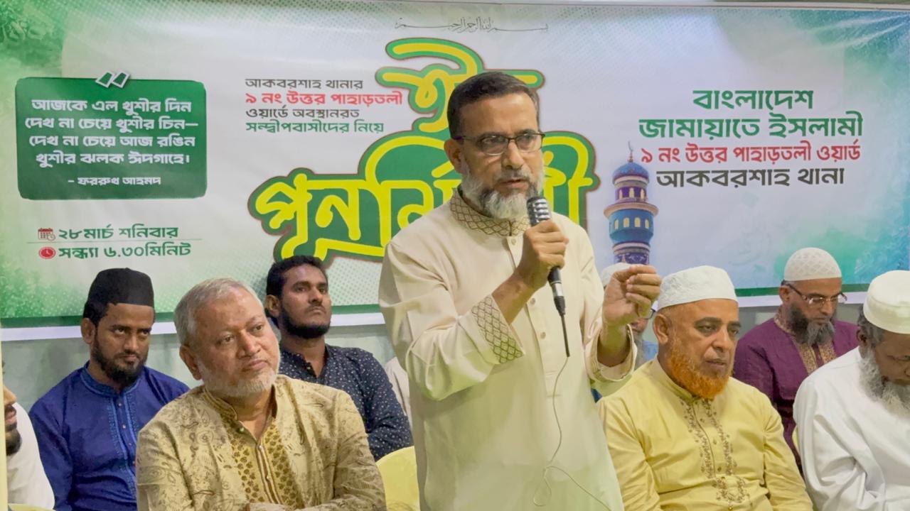 বাংলাদেশ জামায়াতে ইসলামী কেন্দ্রীয় শুরা সদস্য ও উত্তর জেলা জামায়াতের আমীর মোঃ আলা উদদীন শিকদার বলেছেন,ইনসাফ ভিত্তিক সমাজ বিনির্মানে সকলকে ঐক্যবদ্ধভাবে কাজ করতে হবে।তিনি অদ্য ২৮ মার্চ সন্ধ্যায় স্থানীয় একটি কমিউনিটি সেন্টারে ৯ নং উত্তর পাহাড়তলী ওয়ার্ড জামায়াতের উদ্যোগে আয়োজিত ঈদ পুনর্মিলনী অনুষ্ঠানে প্রধান অতিথির বক্তব্য রাখছিলেন।
