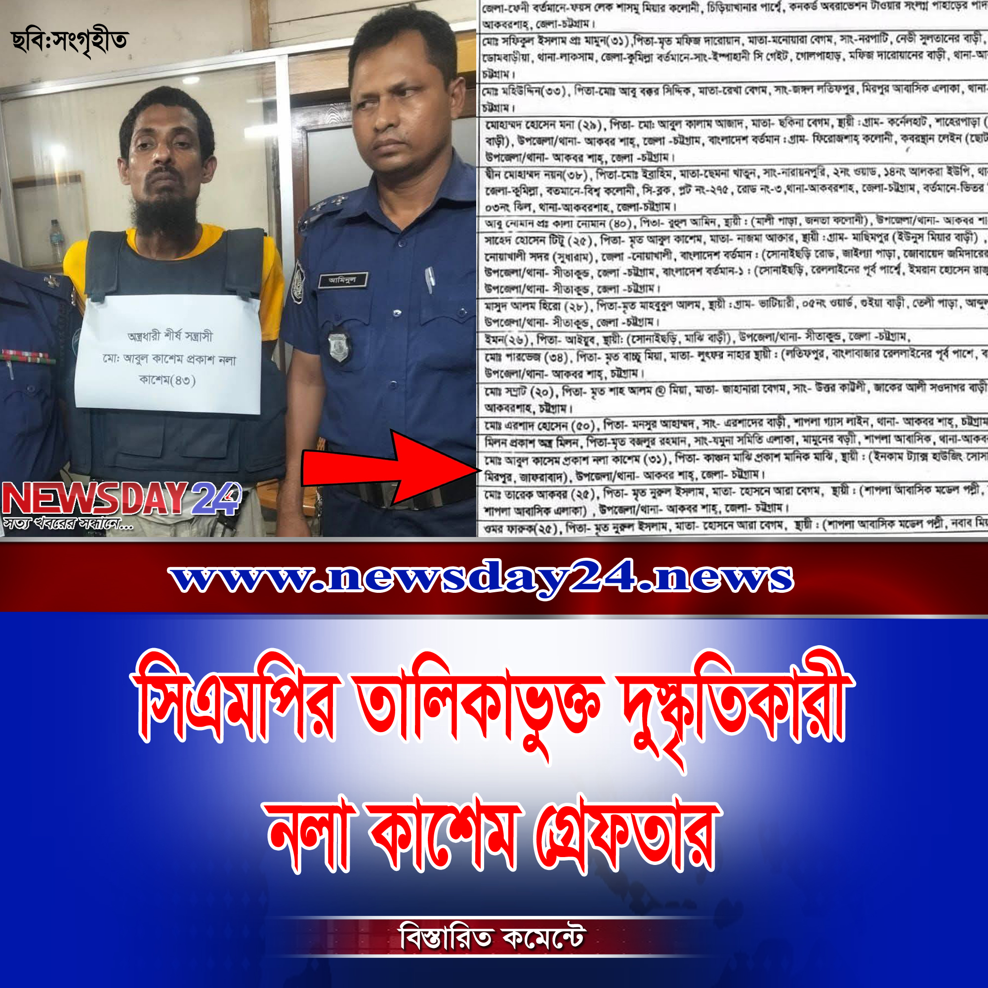 গত ১৭ জানুয়ারি ২০২৬ইং তারিখে সদ্য বিদায়ী সিএমপি পুলিশ কমিশনার হাসিব আজিজ স্বাক্ষরিত ৩৩০ জন দুষ্কৃতিকারীর তালিকা প্রকাশ করে চট্টগ্রাম শহরে অবস্থান ও প্রবেশ নিষিদ্ধ করেছিলেন। সেই তালিকার ১৪০নং থাকা অস্ত্রমামলা সহ একাধিক মামলার আসামী মোঃ আবুল কাশেম প্রকাশ নলা কাশেম (৩১), পিতা: কাঞ্চন মাঝি প্রকাশ মানিক মাঝি-কে বিদেশী অস্ত্রসহ গ্রেফতার করেছে সীতাকুন্ড থানা পুলিশ।