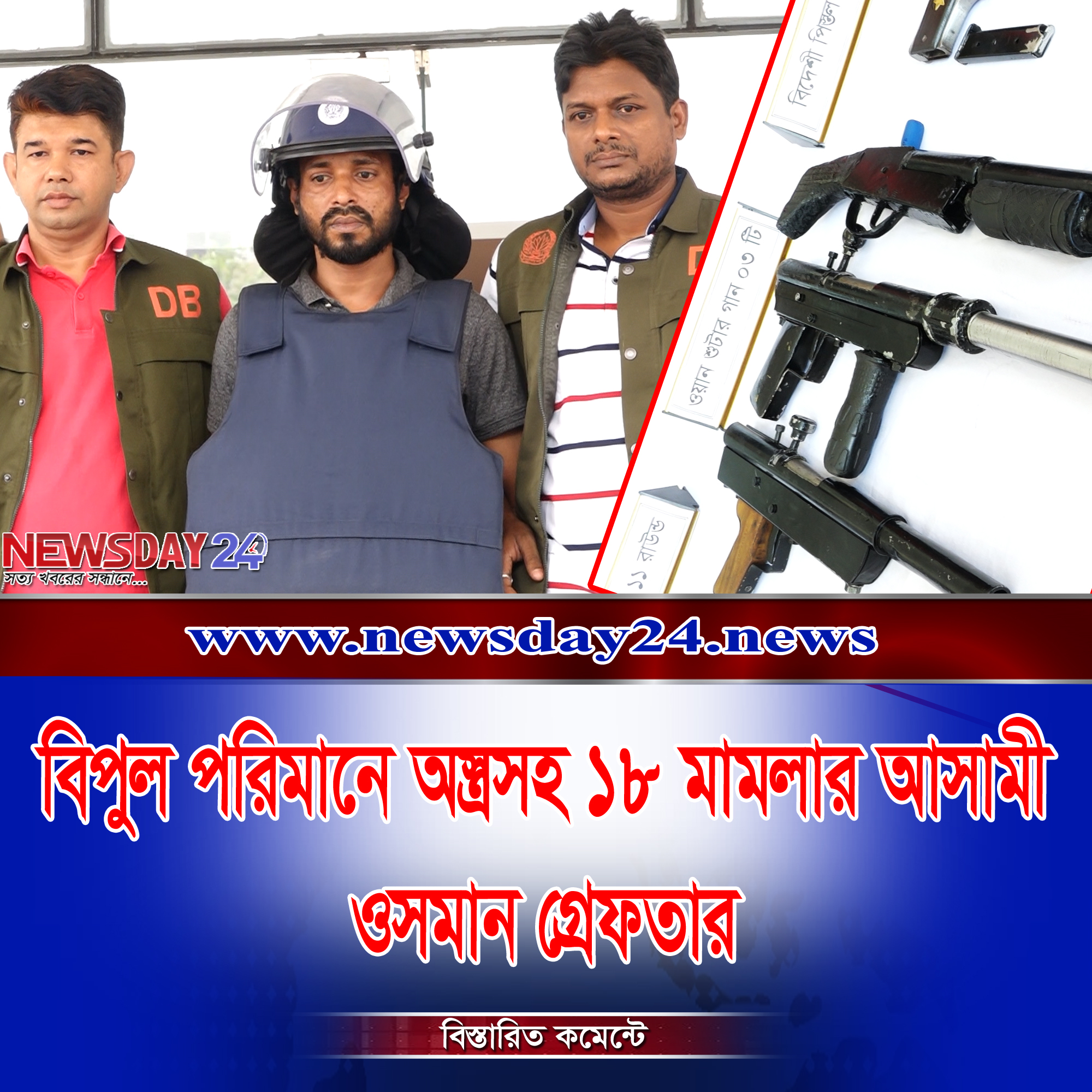 এসময় তার কাছ থেকে একটি বিদেশি পিস্তল (ম্যাগাজিনসহ), তিনটি একনলা শর্টগান, ১১ রাউন্ড পিস্তলের তাজা গুলি, রাইফেলের গুলি, ১৭ রাউন্ড শর্টগানের কার্তুজ, চাপাতি ও সুইচ গিয়ার চাকু, নগদ ৫১ হাজার টাকা ও বিভিন্ন মডেলের একাধিক মোবাইল ফোনসহ অন্যান্য সামগ্রী জব্দ করা হয়েছে।